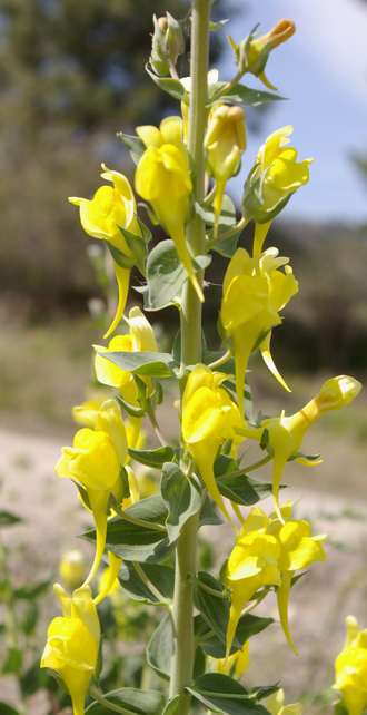 Dalmatian toadflax is a perennial forb with a large taproot, waxy, fleshy leaves, and a showy spike of bright yellow flowers.