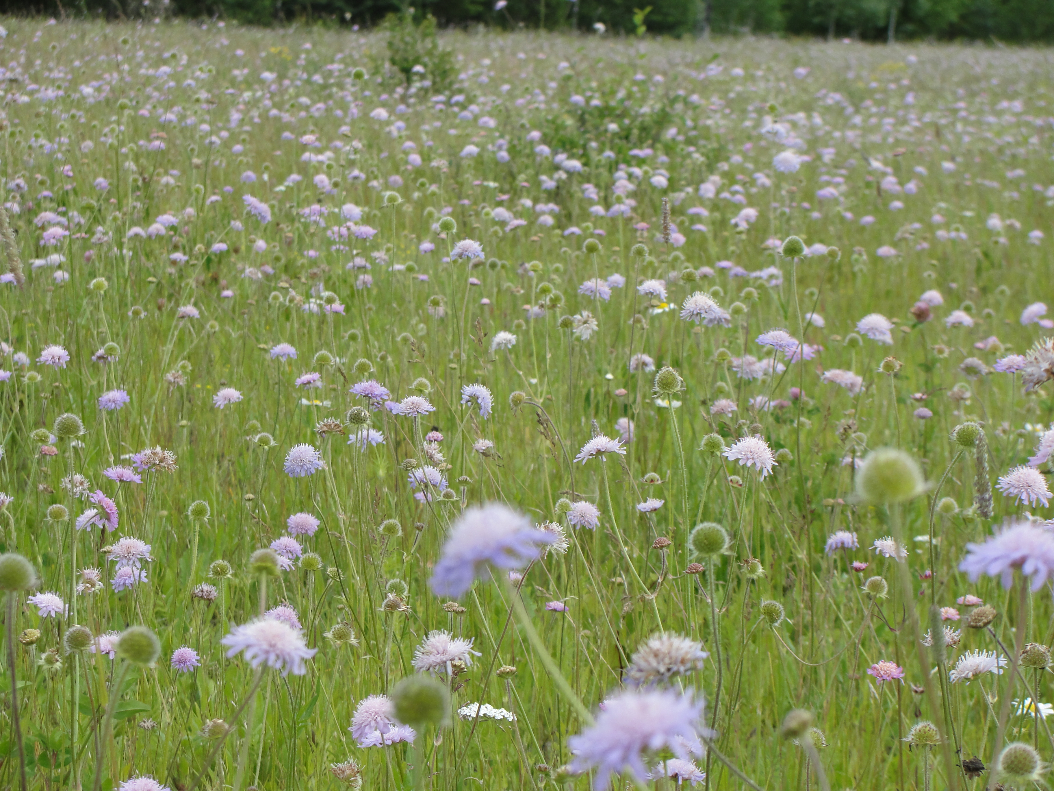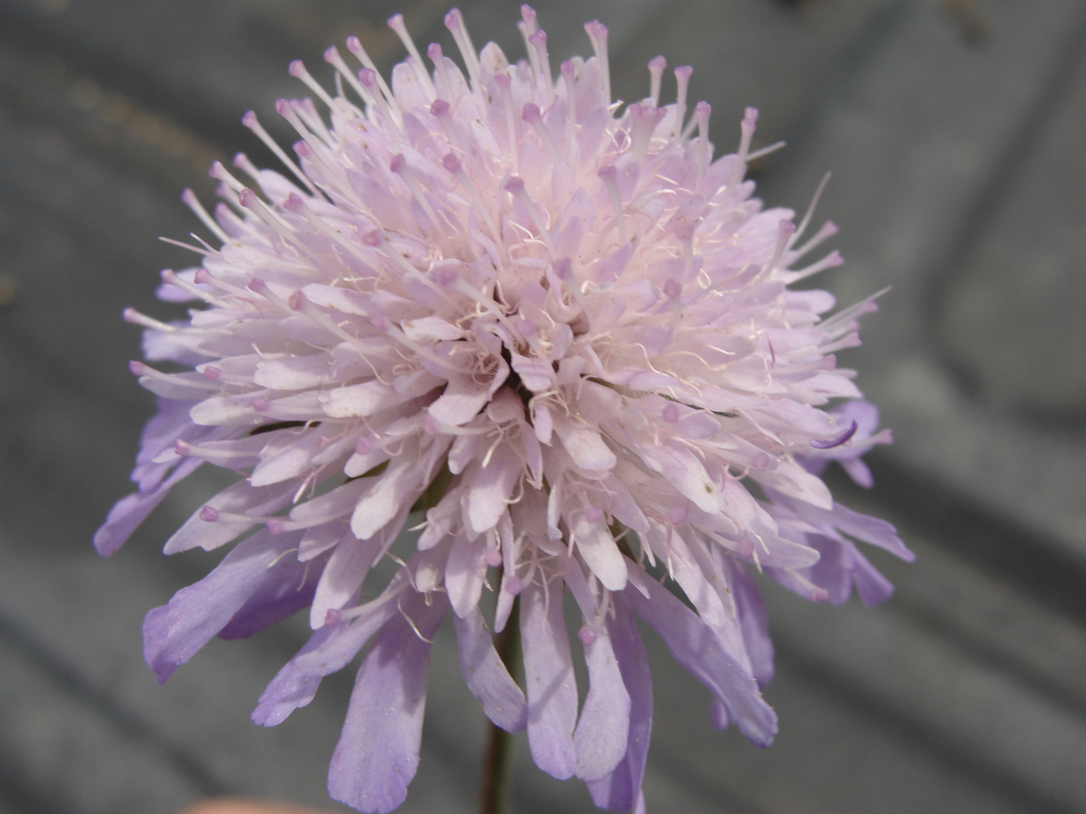 Field scabious is a large, erect forb with a large branched taproot and a single main stem, branching into multiple flower stalks.
