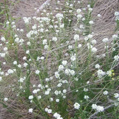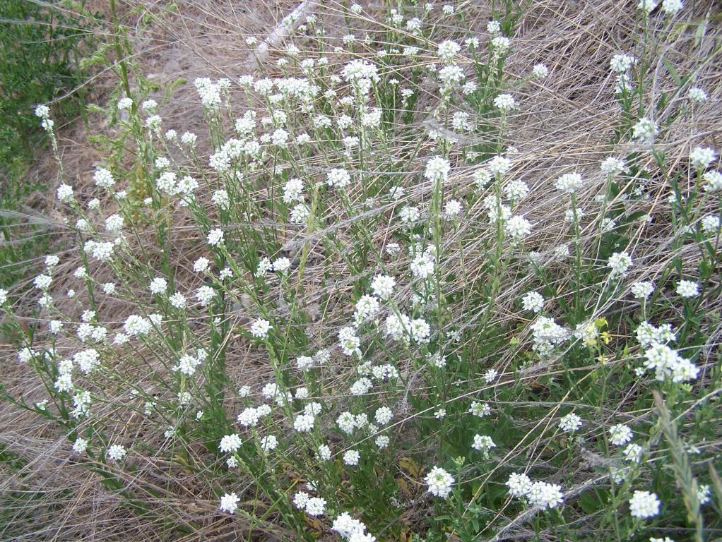 Hoary alyssum is an upright herb that can grow up to 1m tall, single, or multiple stems with small whitish hairs that cover the stems and leaves. The leaves are lance-shaped, rough and fell like sandpaper, greenish in colour and clasp closely to the stem. It has small white flowers that grow in clusters with deeply notched petals. Oval seedpods are 5-8mm long, somewhat flattened, and held close to the stem. One plant can produce about 2,600 seeds.