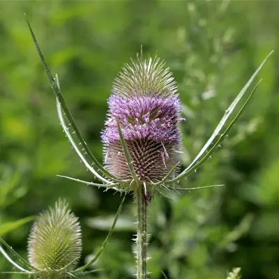 A native of Europe, Teasel is often seen in horticultural planting and dried flower arrangements. Teasel has a stout taproot that may be over two feet deep and 1 inch in diameter at the crown. Plant stems are rigid and can reach heights of up to 6 feet with several rows of downward-facing prickles. Adult plants have large, oblong, opposite, sessile leaves that are prickly, especially on the lower midrib. Flowers are small, generally purple, and tightly packed in oval-shaped heads. The flowers are subtended by stiff, spiny bracts that are terminally on the flowering stems.