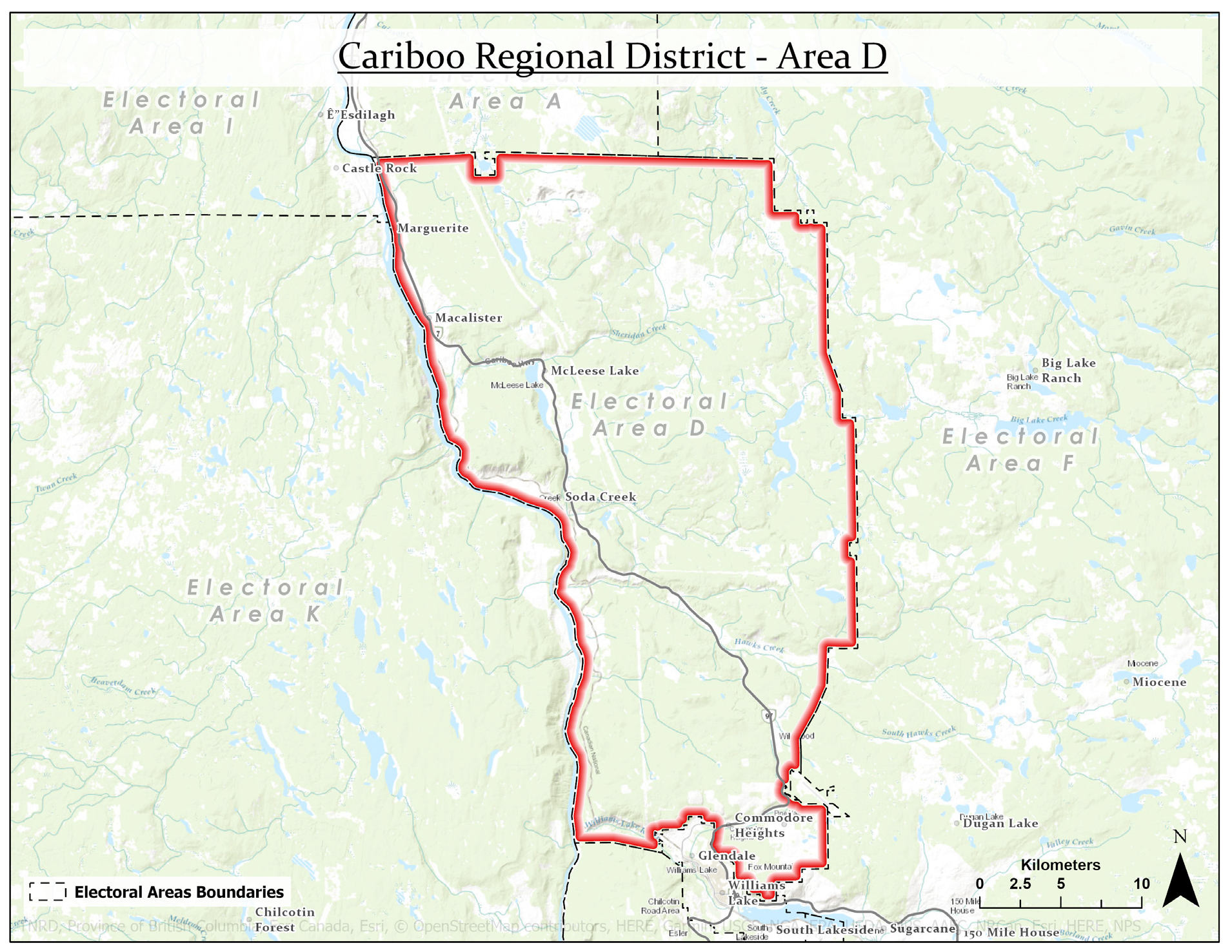 Area D is central located within the CRD, directly south of Area A, with Williams Lake on its south boundary. Despite being the second smallest electoral area, it has a significant population base. The largest community is Wildwood. Other smaller communities include Pine Valley, Deep Creek, Soda Creek Valley, and McLeese Lake. Land Area: 853 sq. km