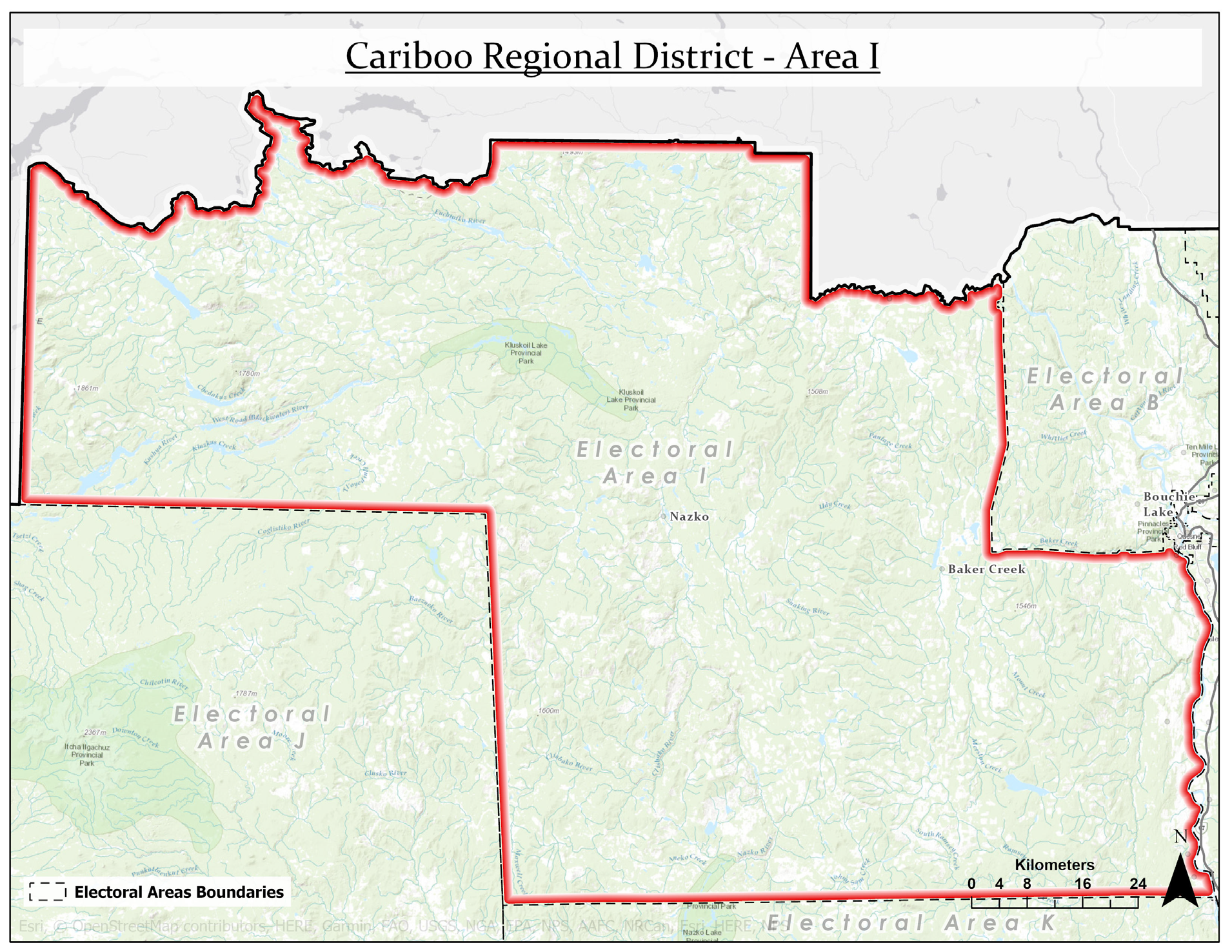 In the North-West corner of the CRD is Area I. It is very large, but has one of the Region's smaller population totals. The largest remote communities in the area are Nazko and Baker Creek. In Nazko, people reside both on and off First Nation reserve lands. There are also numerous people living closer to the Fraser River in the eastern portion of the area. Land Area: 11,947 sq. km