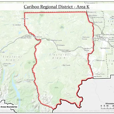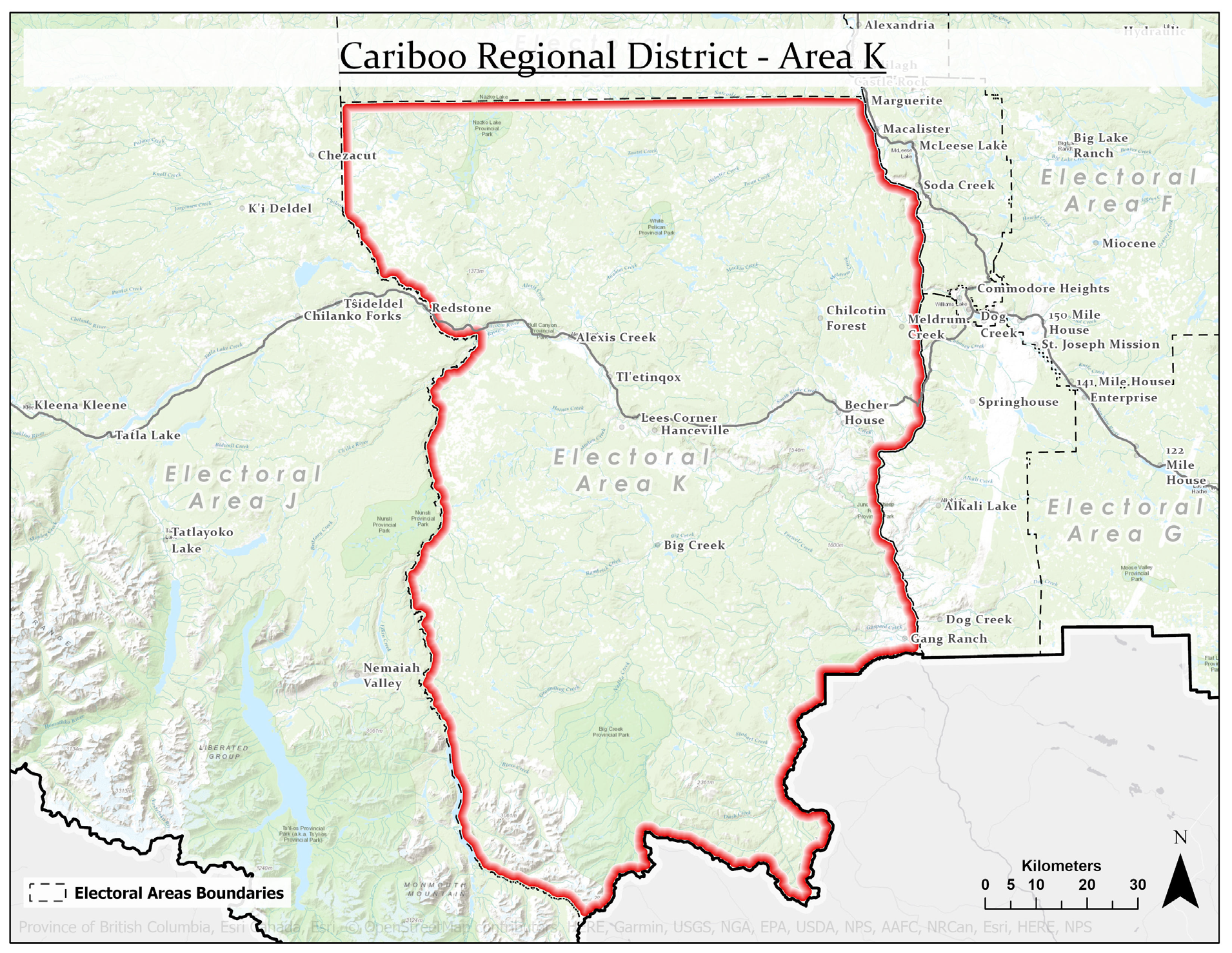 Area K is a large area with a small population, mostly residing in the communities of Alexis Creek, Hanceville, and Riske Creek along the Chilcotin Highway. Land Area: 13,679 sq. km